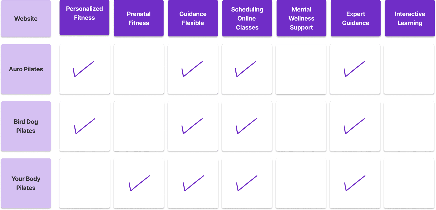 Our competitive analysis focused on evaluating similar Pilates platforms to identify their features, strengths, and gaps. This helps us understand how they serve their target users and what opportunities exist in the market.