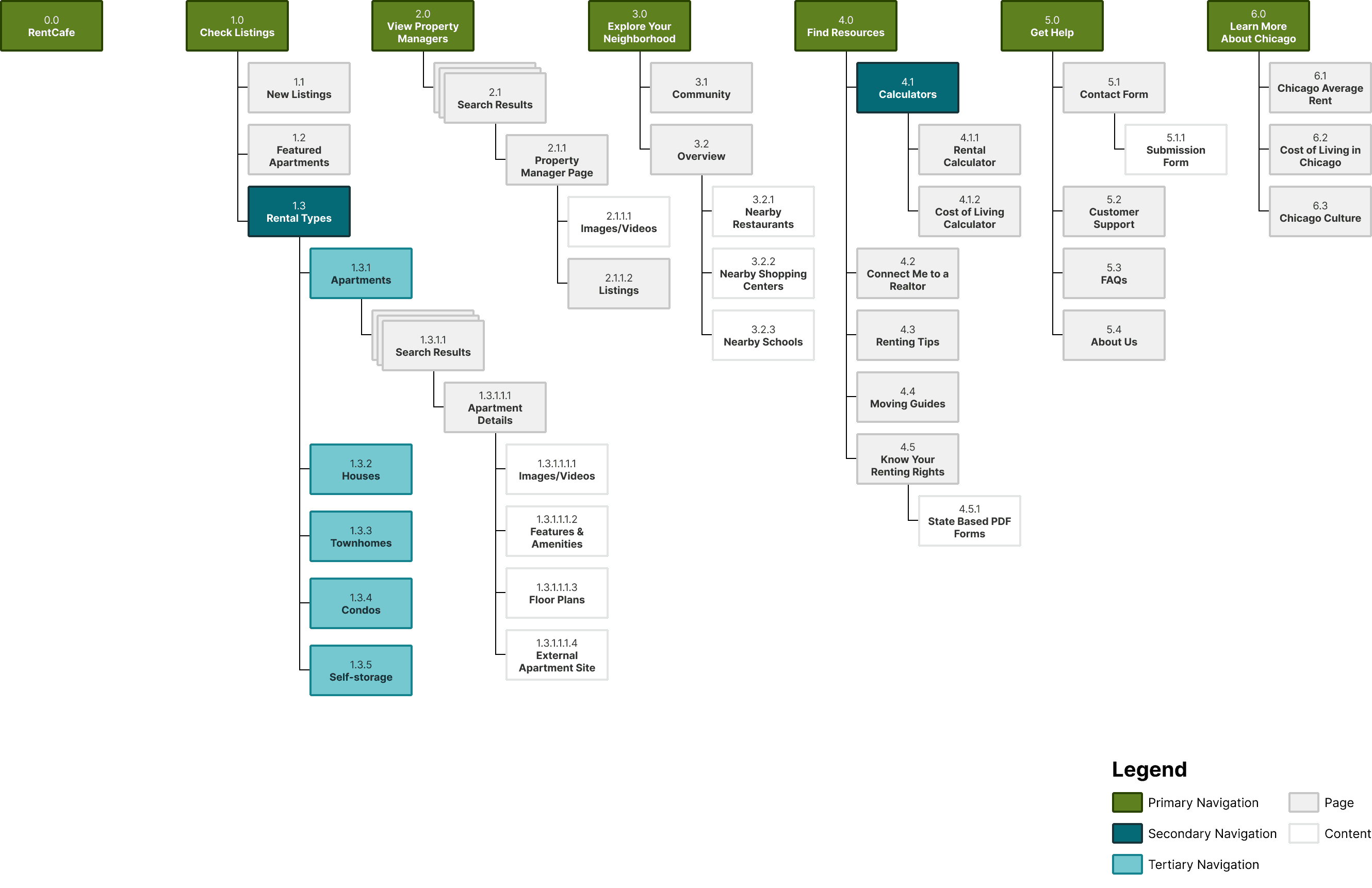 This simplified sitemap is designed to improve the RentCafe user journey, making it easier for renters to access relevant information and complete key tasks efficiently.