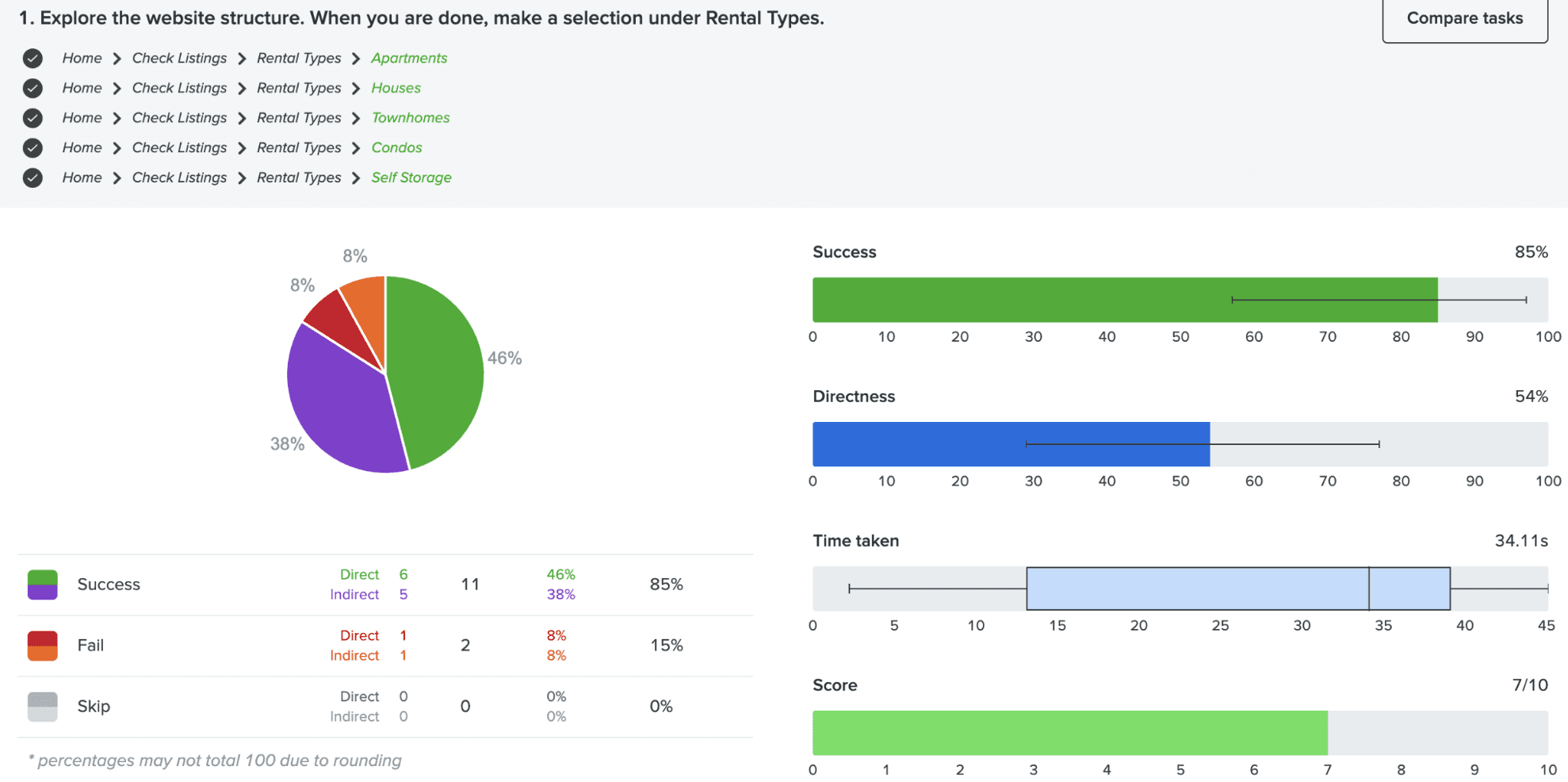 Tree testing was used to evaluate the effectiveness of the newly proposed navigation structure. Tasks were designed to simulate common actions, such as finding an apartment or verifying a landlord.