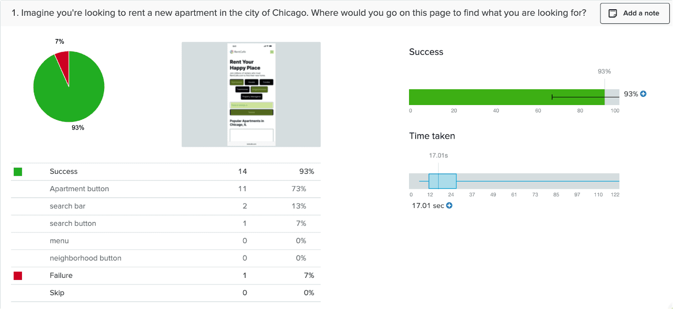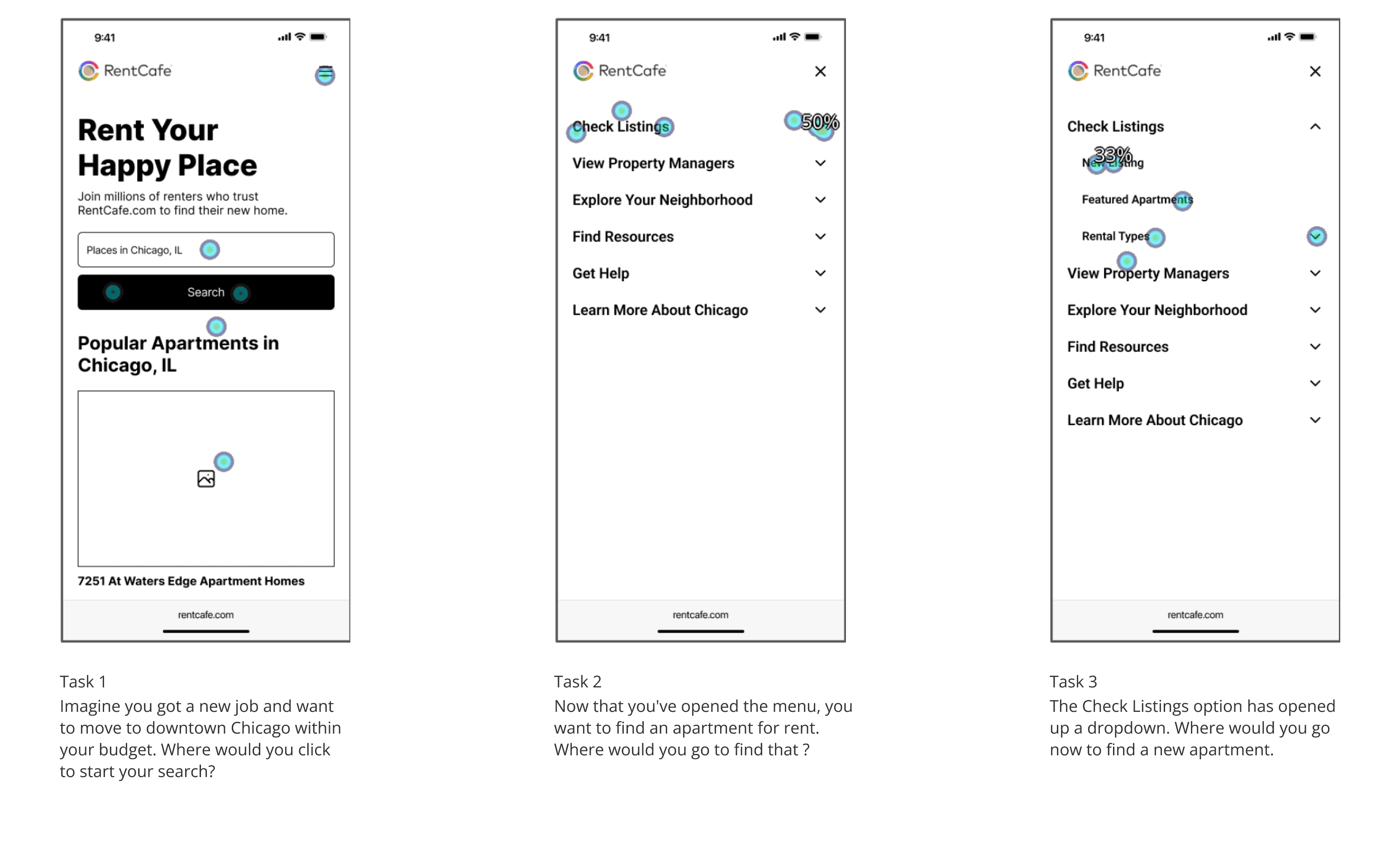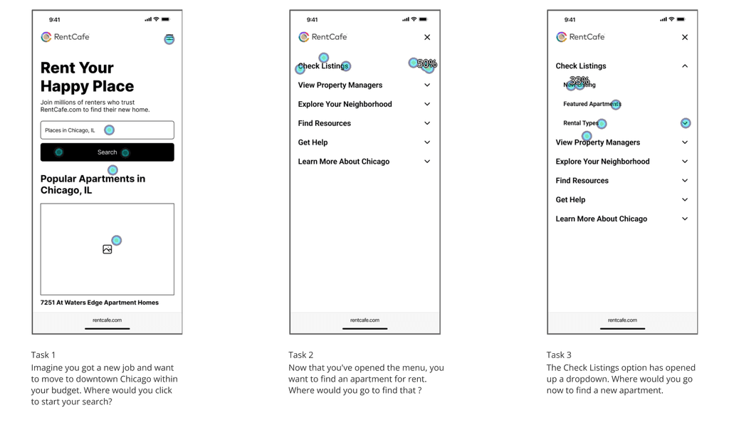 Two rounds of first-click testing were conducted to determine where users expected to find key features, such as rental listings and landlord verification.
