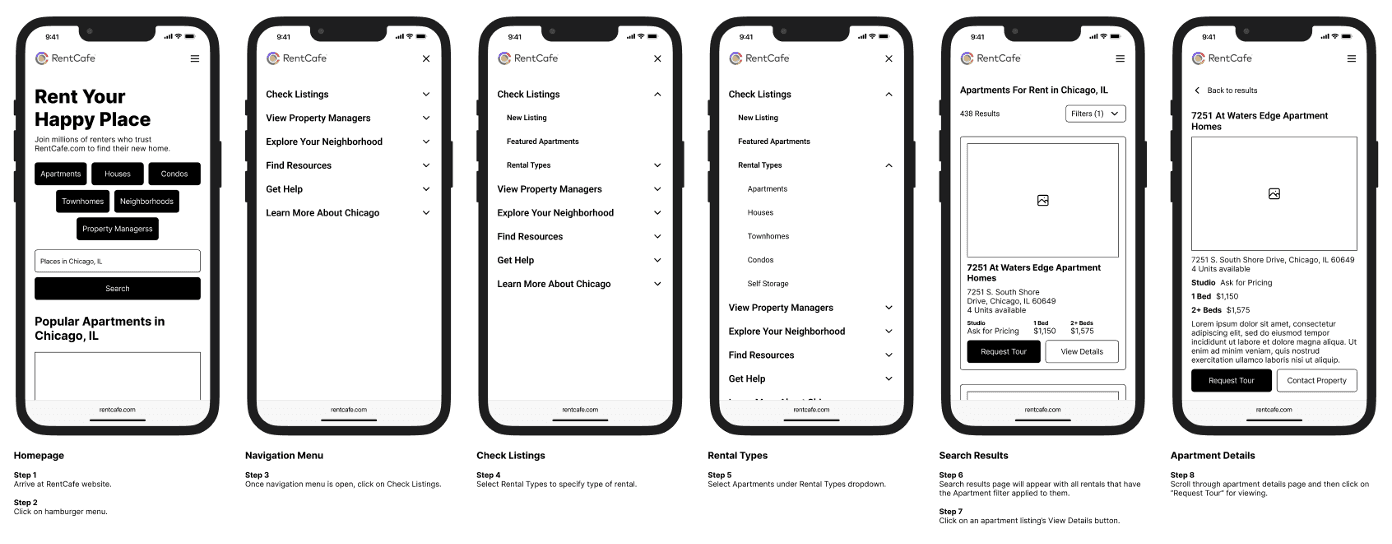 The wireframes for RentCafe were designed with mobile-first principles in mind, focusing on delivering a seamless user experience across devices.