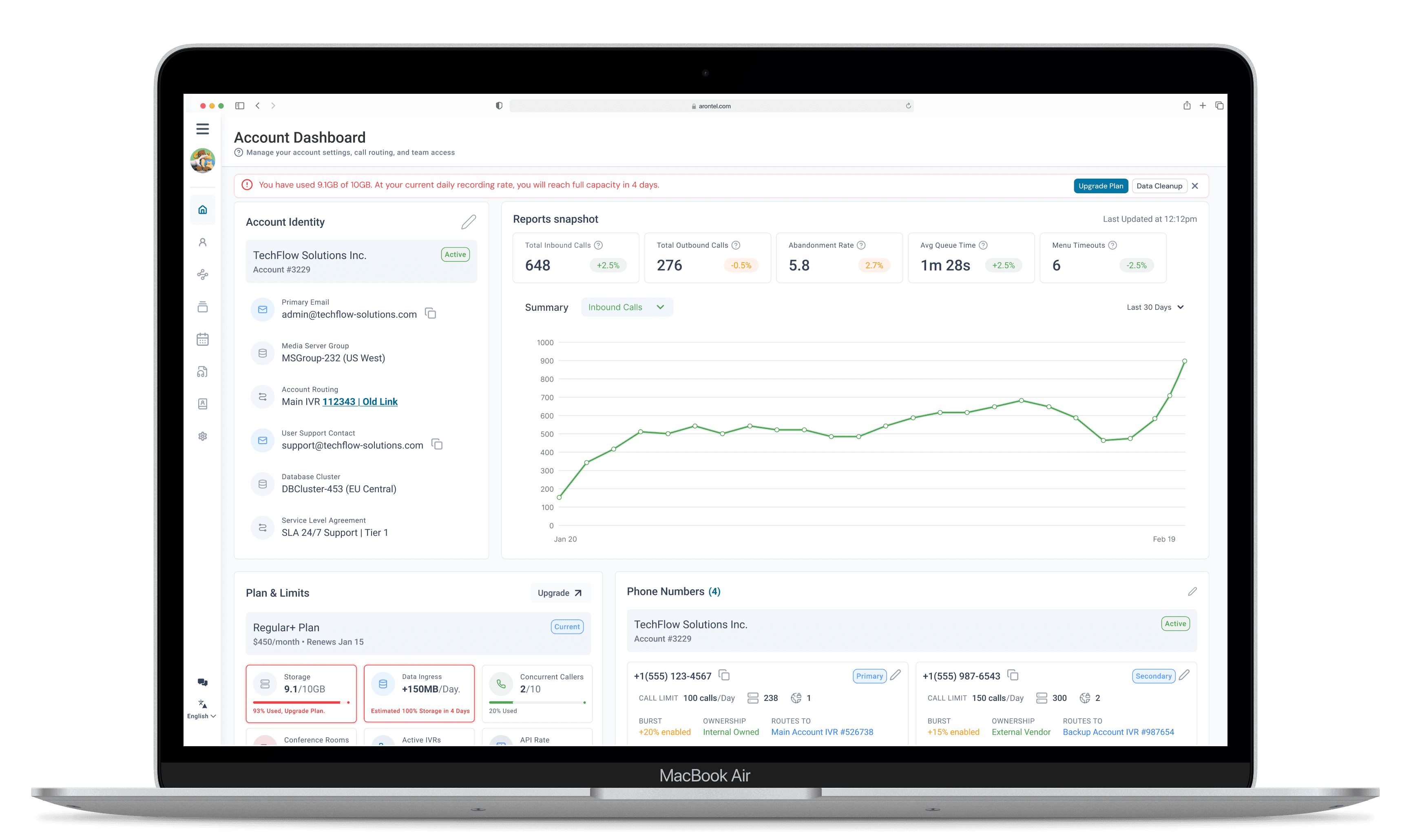 Volivr forecasts exhaustion based on usage trends (e.g., “Full capacity in 4 days”). This gives Ops teams time to upgrade plans or clear storage before call recordings fail.